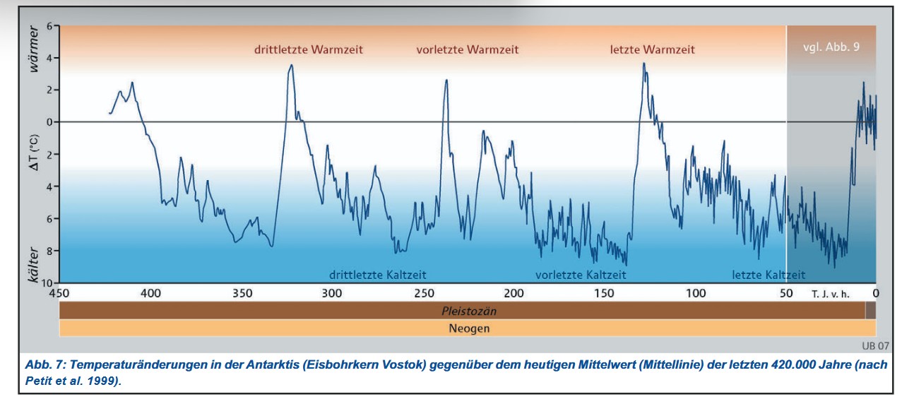 Quelle: https://edoc.hu-berlin.de Danach schwankte die mittlere globale Erdtemperatur währende der letzten 400000 Jahre um etwa 12°C – und die heutigen globalen Temperaturen liegen bereits im oberen Bereich dieser natürlichen Schwankungsbreite!